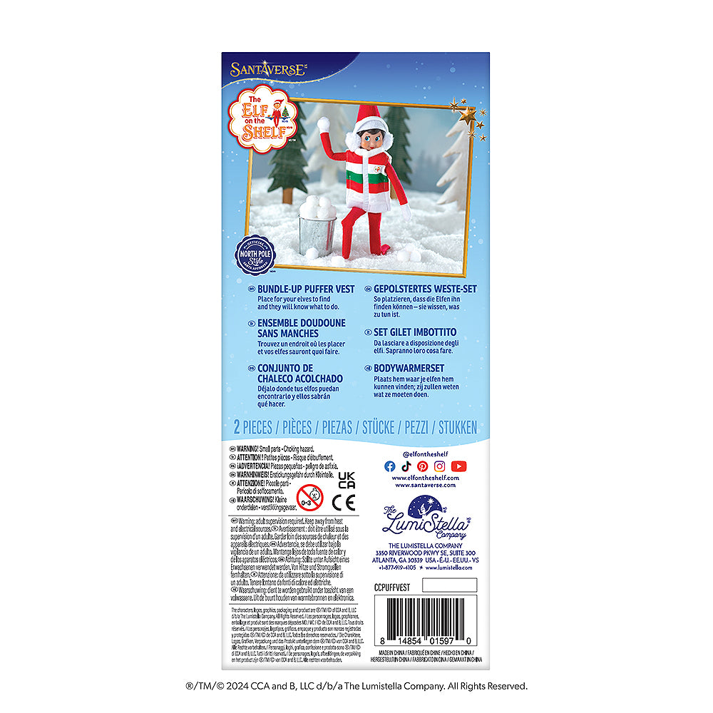 This slim-fit, hip-length puffer vest and earmuff combo is for on-trend elves who want to be warm and look cool. White fluff earmuffs complete the look.